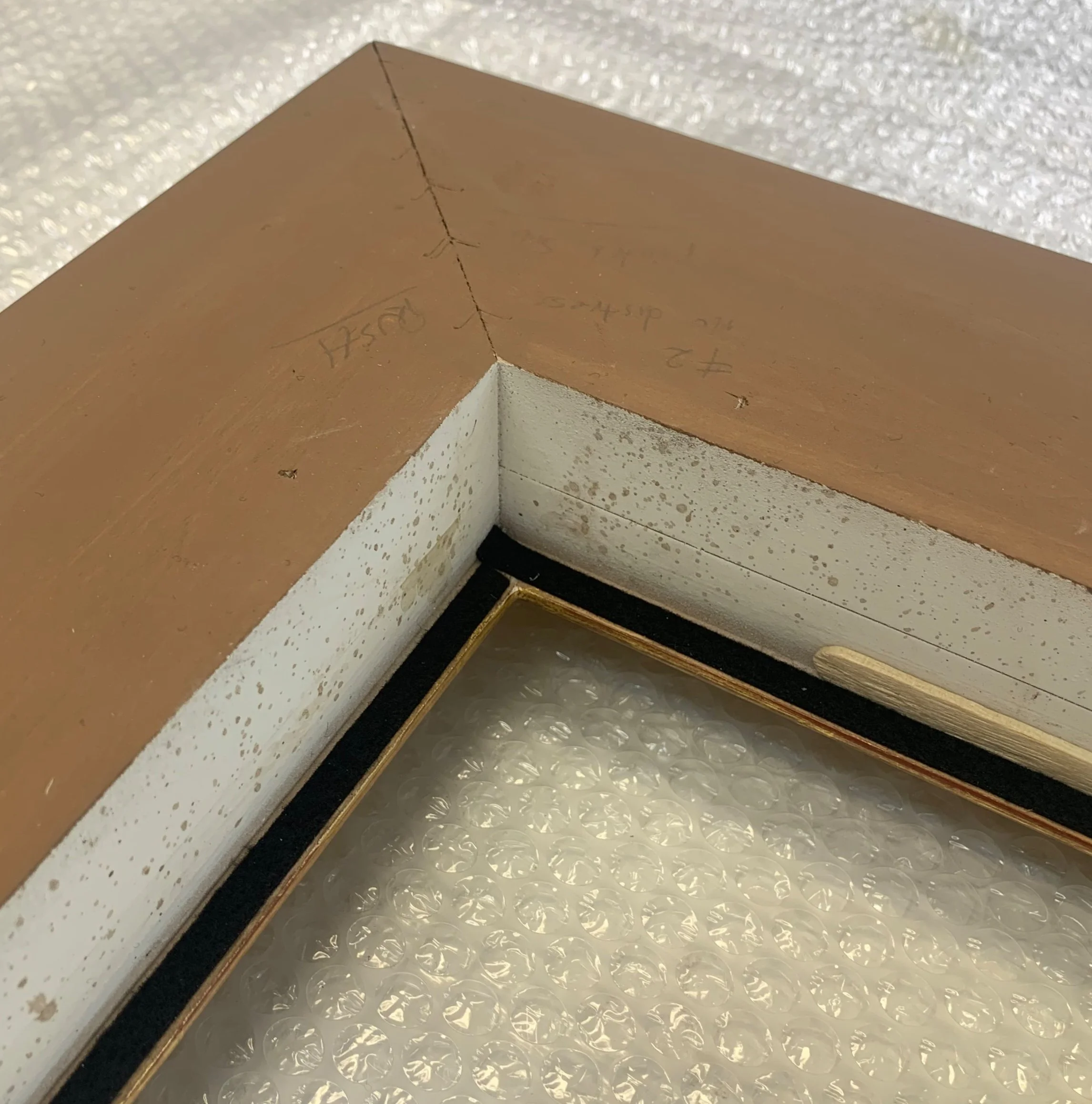 We first make sure that the frame is large enough to accommodate the size of the painting. A painting should never be forced into the frame opening. A tight frame can cause distortions to appear in the canvas as the stretcher expands and contracts under different environmental conditions. If the frame opening is too small, we will carve out the inner edge to make sure the painting fits well. The painting should also not be able to move around excessively in the opening. The addition of spacers along the edges can create a opening that holds the painting in proper position.