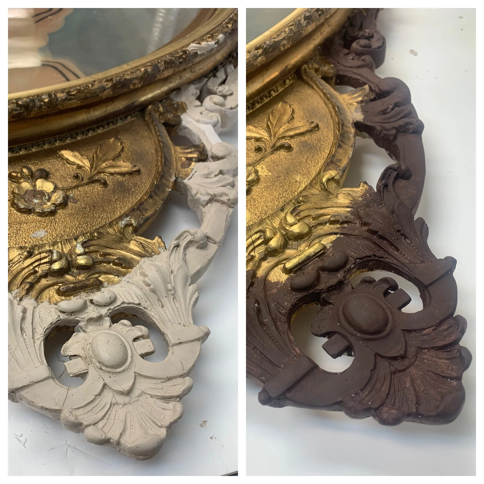 Once the structure was complete, the restored areas were coated with gesso and bole, gilded with 23k gold leaf, and then toned to match the existing patina of the frame.